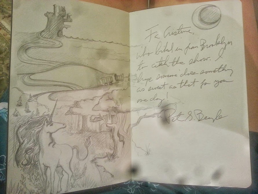 Peter S. Beagle, the author of one of my favorite books “The Last Unicorn” was in town last week. He is on tour screening the film adaptation of the book. What a fantastic and surreal evening I had with my wonderful sister. We met Mr. Beagle, learned about his inspiration and struggles with the book, and talked to many other fans clad in some of the best cos-play I’ve seen in a while.