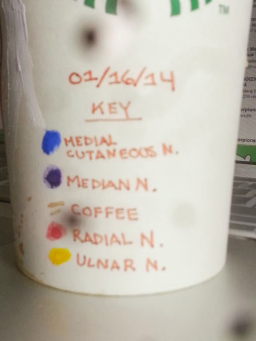 In other awesome, hand nerve news…. When you “bump your funny bone” you are hitting your Ulnar N. that runs very superficially by your elbow. Next time you bump it, instead of inventing some new four letter words, take a breath and see if the pain / tingling is on the outside (yellow in the painting) bit of your hand. Cool eh?