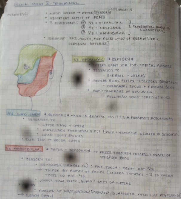 This makes further sense when you realize that The Trigeminal nerve has three branches pairs of branches (or three sets of twins…), noted below in the green, blue, and red: