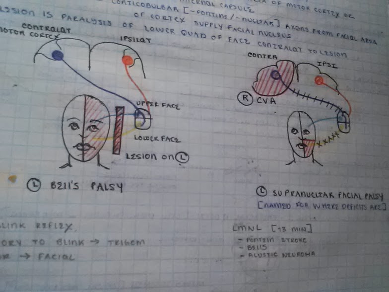 Where as a supranuclear lesion (such as a stroke) in the motor cortex or posterior limb of the internal capsule in the brain would only affect the the bottom half of one side of the face on the OPPOSITE side of the lesion. This is because the unaffected hemisphere of the brain is still innervating the top part of the face. Check it out, the red lines are drawn through affected areas: